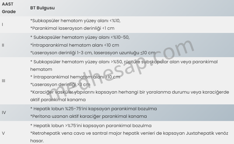 | III | * Subkapsüler hematom yüzey alanı >%50, rüptüre subskapular alan veya parankimal hematom * İntraparankimal hematom alanı >10 cm *Laserasyon derinliği >3 cm *Karaciğer vasküler yapılarını kapsayan herhangi bir yaralanma durumu veya karaciğerde aktif parankimal kanama |